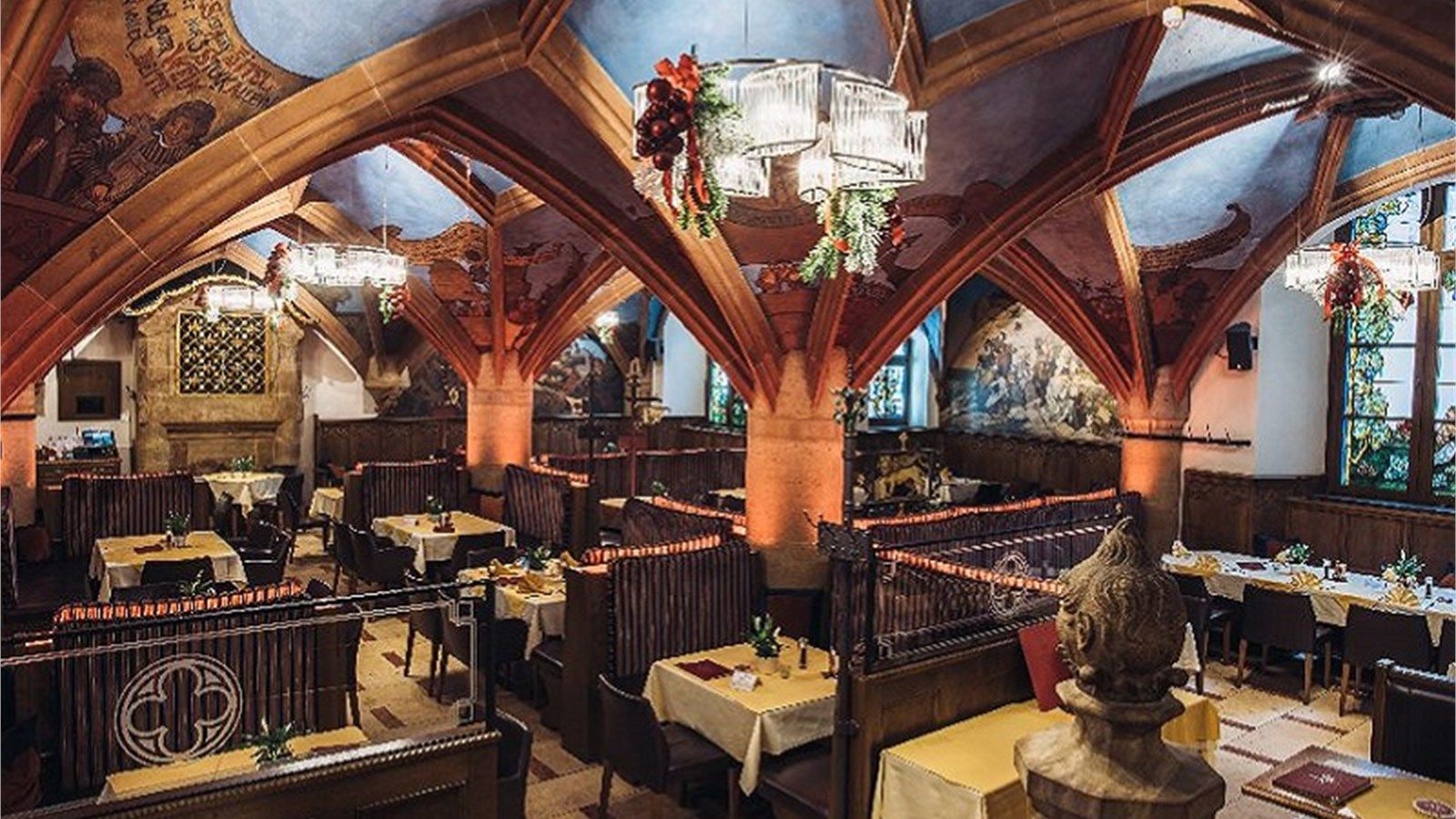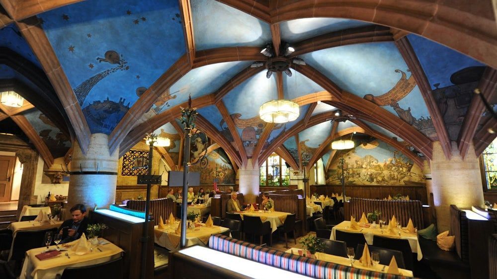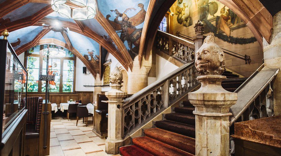 Der Kunstmaler Heinrich Schlitt hatte bei der Gestaltung der naiven Darstellungen viel Humor bewiesen. Georg von Hauberisser, der von der damaligen Verwaltung und den Ratsherren beauftragte Architekt und Baumeister, entwarf auch die Einrichtung des Ratskellers, dem romantischen Zeitgeist entsprechend im Stile der Gotik des XVI. Jahrhunderts.